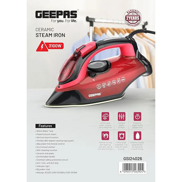 اتو بخار سرامیکی جیپاس مدل GSI24026 با توان 3100 وات، مخزن آب 350 میلیلیتری و کفی سرامیکی ضدخش، انتخابی عالی برای اتوکشی سریع و حرفهای است. این اتو قابلیت بخاردهی عمودی، سیستم ضدچکه، تمیزکنندگی خودکار و کنترل دمای قابل تنظیم دارد